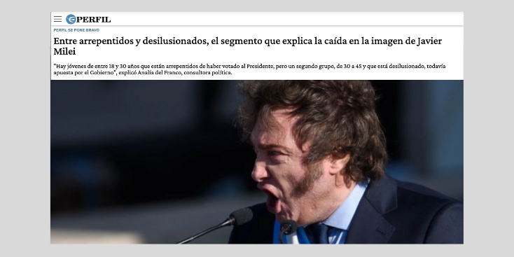 Bravo TV / Perfil.com. La analista política Analía Del Franco participó en el programa “Soy casta”, emitido por Bravo TV, donde habló junto a Carmela Bárbaro de la coyuntura actual, de la pérdida de apoyo del presidente Javier Milei y de la fragmentación de la oposición. En el programa, la experta señaló: «Hay jóvenes de entre 18 y 30 años que están arrepentidos de haber votado al Presidente, pero un segundo grupo, de 30 a 45 y que está desilusionado, todavía apuesta por el Gobierno».